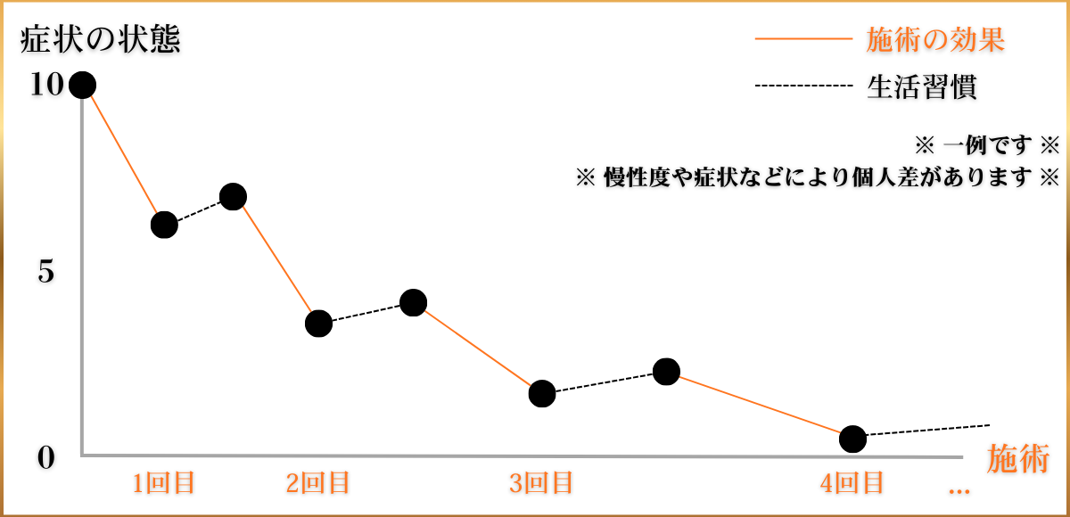 身体には状態を一定に保とうとする機能(ホメオスタシス)があり、1度施術をして症状が緩和した後でも食生活・運動習慣・仕事の環境などの様々な要因も相まって施術前の状態に戻ろうとしてしまいます。
