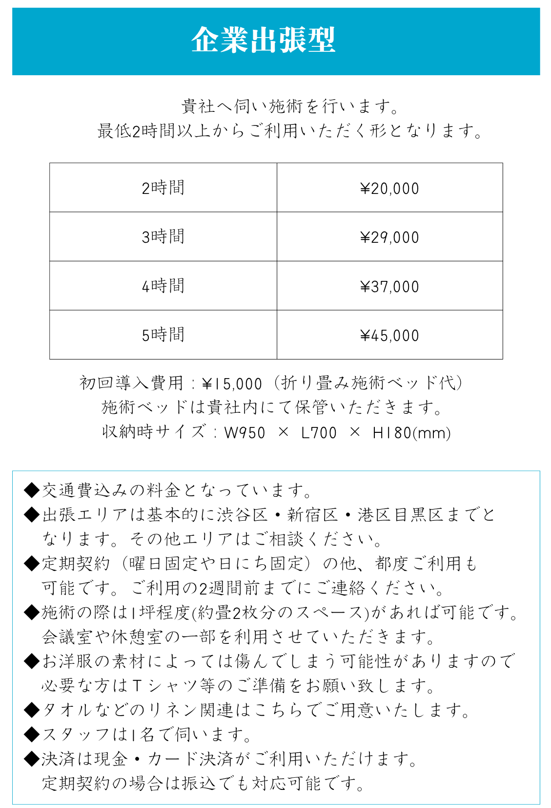 ぜひ従業員の皆様を施術させていただき、仕事のパフォーマンス改善とともに会社への満足度を高める一助となれば幸いです。